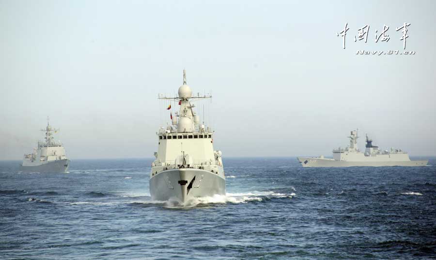 赴俄参加“海上联合-2013”中俄海上联合演习的中方舰艇编队自7月1日离开青岛某军港以来,即遭遇大雾天气和恶劣海况。编队指挥所利用航渡时机见缝插针展开针对性训练,巩固前期训练效果,提高部队整体训练水平。7月3日,中国海军舰艇编队在日本海某海域,开展编队队运动、对海对空攻击与防御、复杂电磁环境下对抗等训练。(来源:中国军网 钱晓虎、孙阳摄影报道)