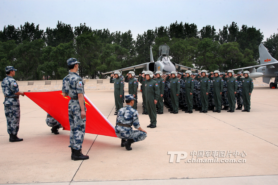 7月27日,参加中俄联演的空军战斗群官兵出征前在国旗前集体宣誓,立志圆满完成联演任务,为祖国争光。曹占礼摄