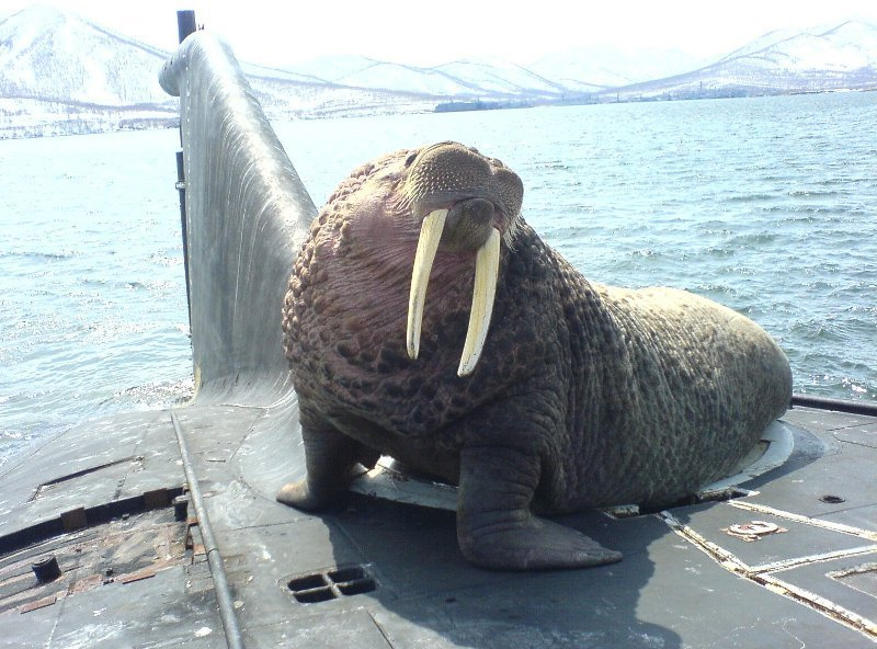 海象上艇休闲:俄军核潜艇迎来“稀客”