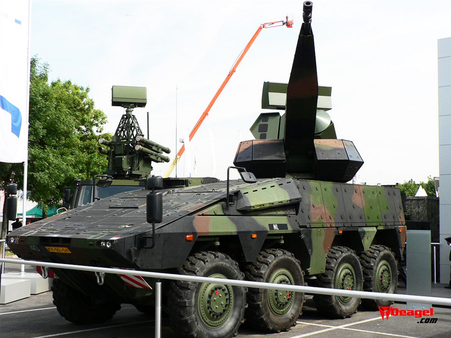 图片为德国研制的“天空游骑兵”轮式自行高炮,它是新型35毫米轮式自行高炮的最重要代表,其底盘采用了德国陆军的“拳击手”轮式装甲车,未进入部队服役。