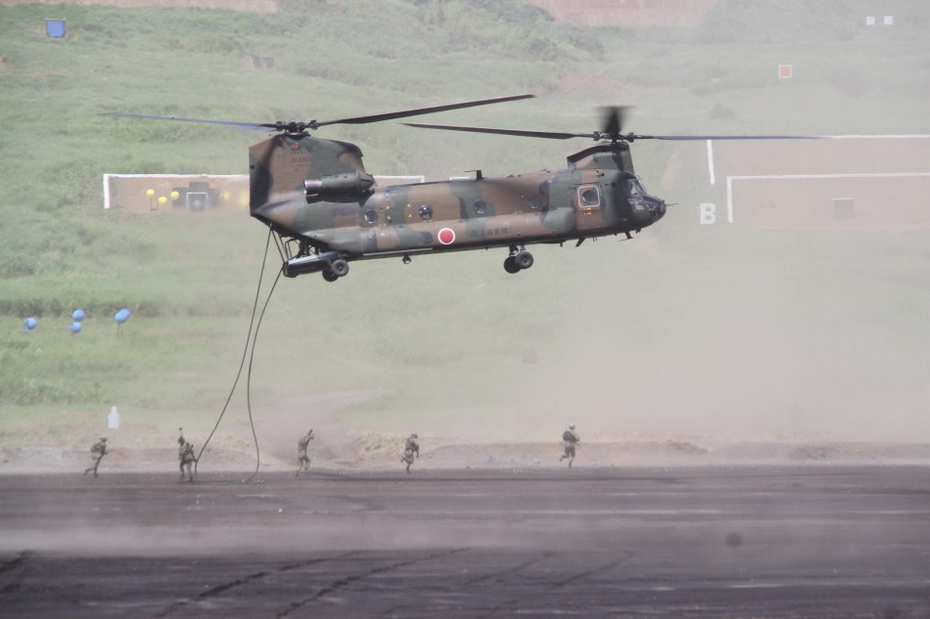 8月20日,在日本静冈县御殿场市的东富士演习场,日本陆上自卫队运输直升机CH-47J进行运兵空降演练。当日,日本陆上自卫队开始举行2013年度富士综合火力演习。日本陆上自卫队富士学校总务宣传班长永井利弘表示,今年演习的一个突出特点是加强了攻击能力的演练。富士综合火力演习始于1961年,是日本陆上自卫队的例行演习,也是日本国内举行的最大规模实兵实弹射击演习,近年来通常每年举行一次。新华社记者陈锐摄