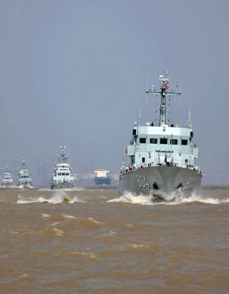 东海舰队某水警区扫雷舰艇编队模拟引导商船安全通过雷区(8月15日)。新华社发(江山 摄)