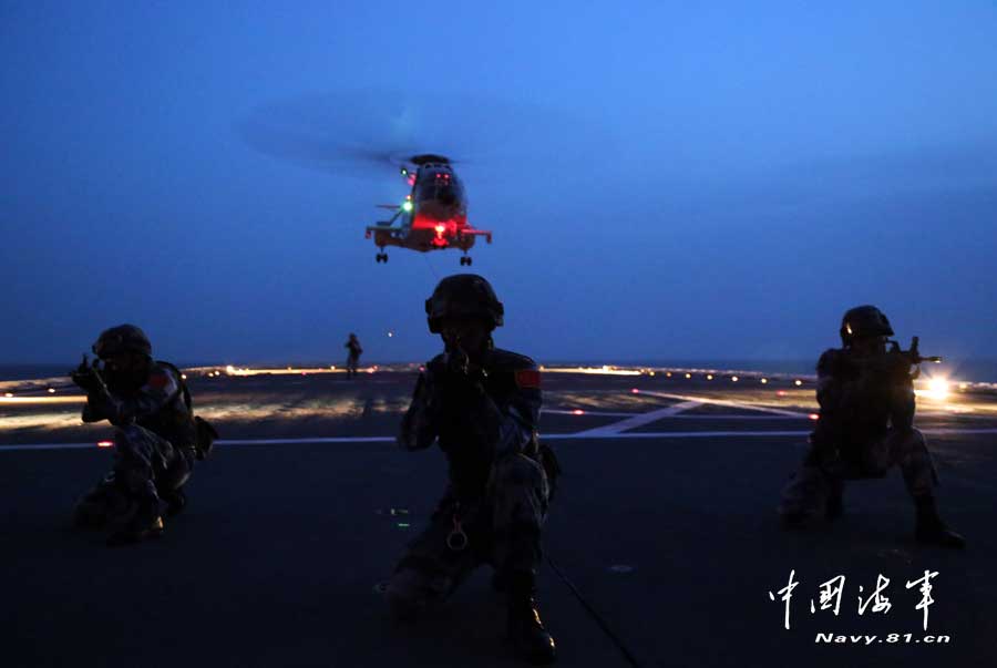 动作帅气:中国护航特战员夜间滑降坞登舰