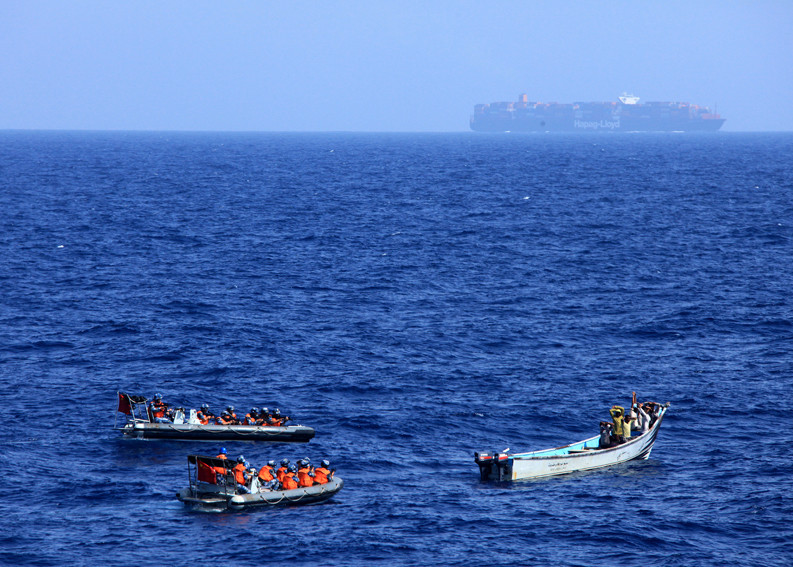 9月3日,衡水舰工作艇前出抵近可疑小艇进行查证。当地时间9月3日14时11分,正在亚丁湾西部海域执行第625批护航任务的中国海军第十五批护航编队衡水舰发现2艘可疑小艇靠近被护商船。衡水舰迅速进入一级反海盗部署,并派出两艘工作艇搭载特战队员前出进行查证驱敌。14时39分,编队在确定无异常情况后将可疑小艇驱离。新华社发(左双龙 摄)