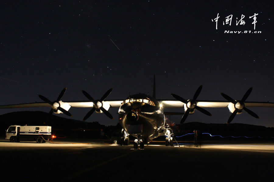 中国海军神秘警戒机飞训 夜色光影下身姿销魂