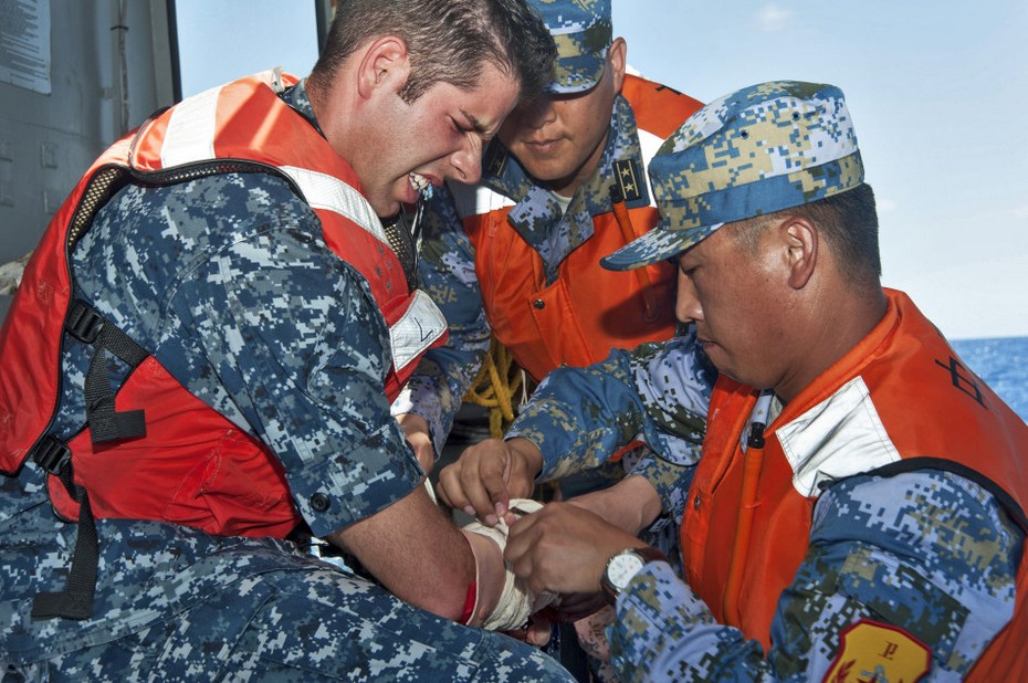 2013年9月9日,美国海军伊利湖号导弹巡洋舰上,中国海军水兵正在为美军水兵进行战伤救护。