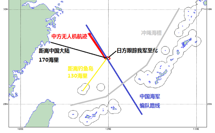 日方舰机对我返航的海军编队进行跟踪监视以及中国无人机飞行路线示意图