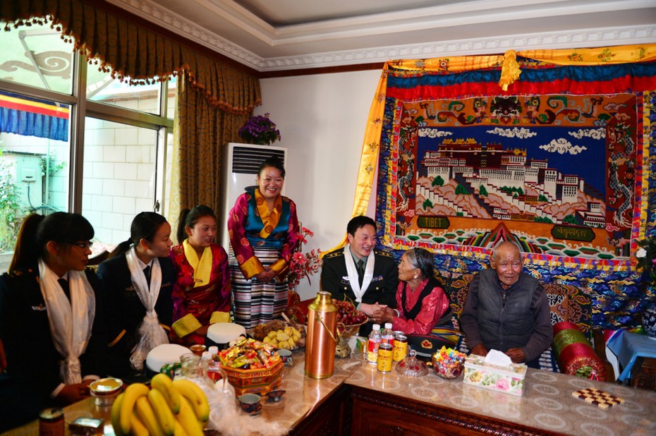 一个月来,300多名藏族女大学生经过报名、体检、综合素质考评、政审等一系列严格筛选,最后10名优秀藏族女青年脱颖而出,成为首批海军藏族大学生女兵。图为9月10日,西藏军区机关干部和海军部队接兵干部到首批海军藏族大学生女兵巴桑卓玛家进行家访。新华社发(张震 摄)