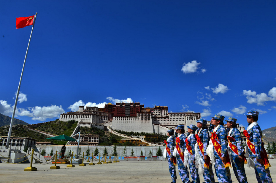 9月12日,即将出藏的首批海军藏族大学生女兵在布达拉宫广场向国旗行军礼。新华社发(张震 摄)