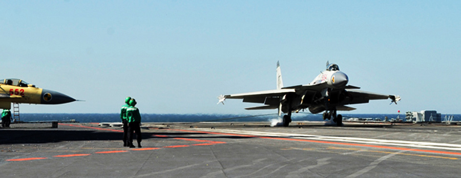 歼-15舰载战斗机成功阻拦着舰。摄影:胡锴冰