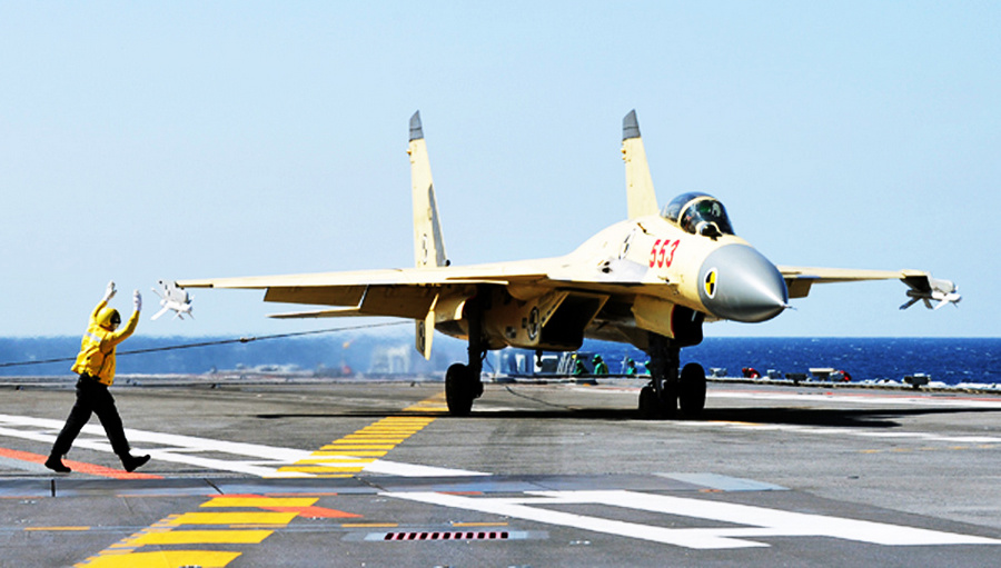 歼-15舰载战斗机成功阻拦着舰。摄影:胡锴冰