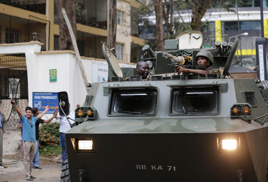 9月21日,在肯尼亚首都内罗毕,一辆装甲车抵达交火地点。肯尼亚红十字会21日说,首都内罗毕购物中心遭武装人员袭击事件已经造成20人死亡,数十人受伤。新华社记者张晨摄
