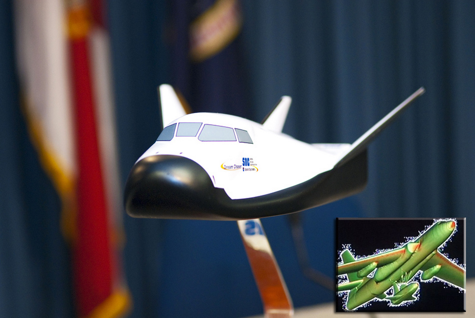 图片为美国追梦者飞船模型,下面的电视截图是计算机生成的轰六空中投放“神龙”图像。这种投放应该是用来试验“神龙”在大气层中的低速飞行性能、着陆性能、和进场滑行性能,让验证飞行器进行自由飞之后,就要进行实际的发射试验。