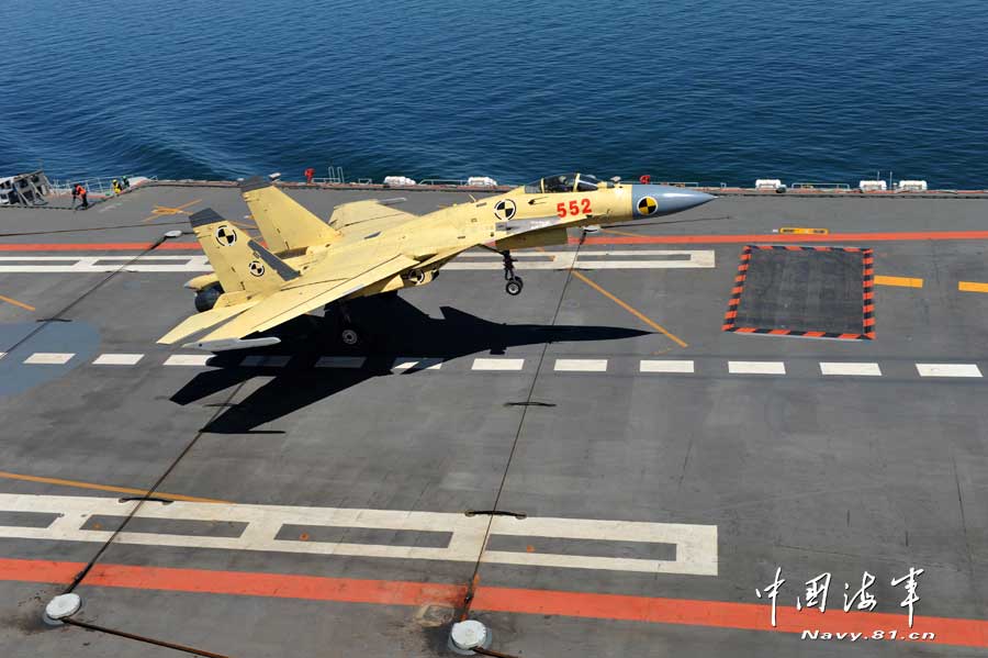 歼-15舰载战斗机降落辽宁舰。-李唐-摄