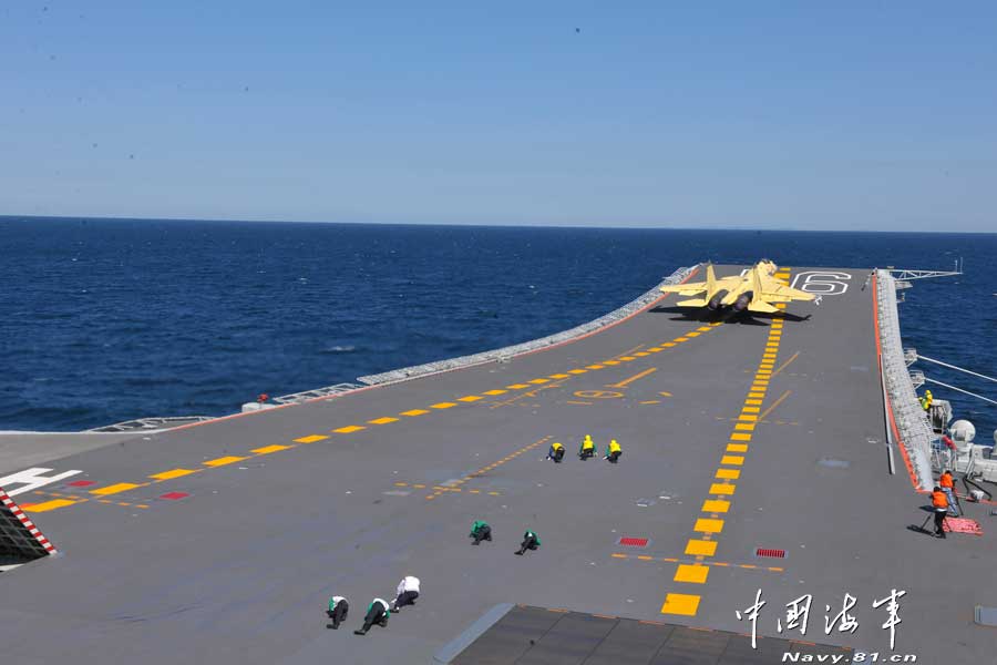 歼—15舰载战斗机短距离滑跃起飞。摄影:张凯