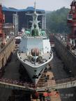 10月7日,最新建造的一艘054A型护卫舰被运送到浮动船台上,即将下水。