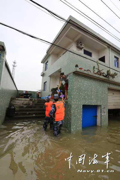 海军官兵赶赴余姚救灾 蹚水挨家挨户送食品
