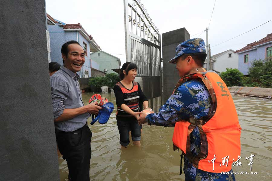 海军官兵赶赴余姚救灾 蹚水挨家挨户送食品
