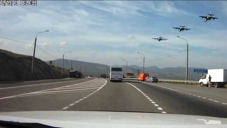 行车记录仪拍摄下的画面,数架苏-25攻击机以编队形式超低空飞过。