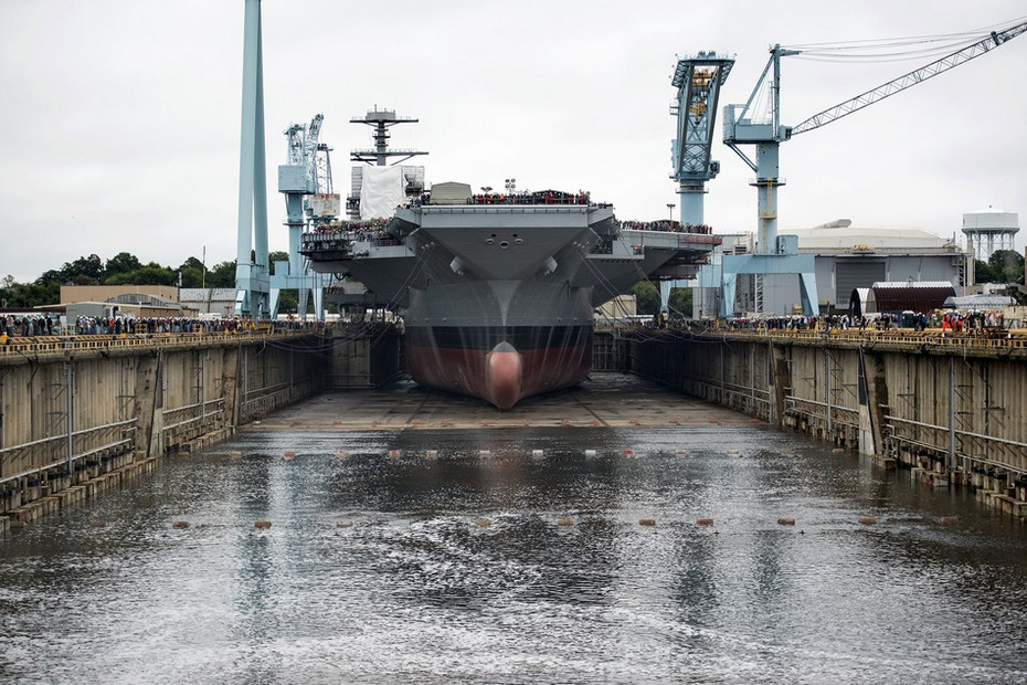 美国海军福特号航母所在船坞进行注水