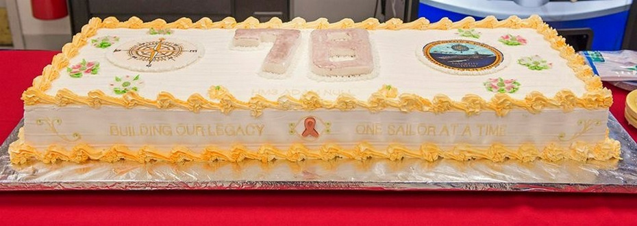 当地时间10月10日,美国海军士兵们切蛋糕提前庆祝福特号航母下水。