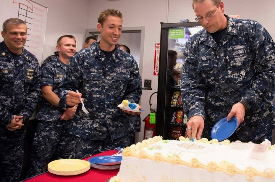 当地时间10月10日,美国海军士兵们切蛋糕提前庆祝福特号航母下水。