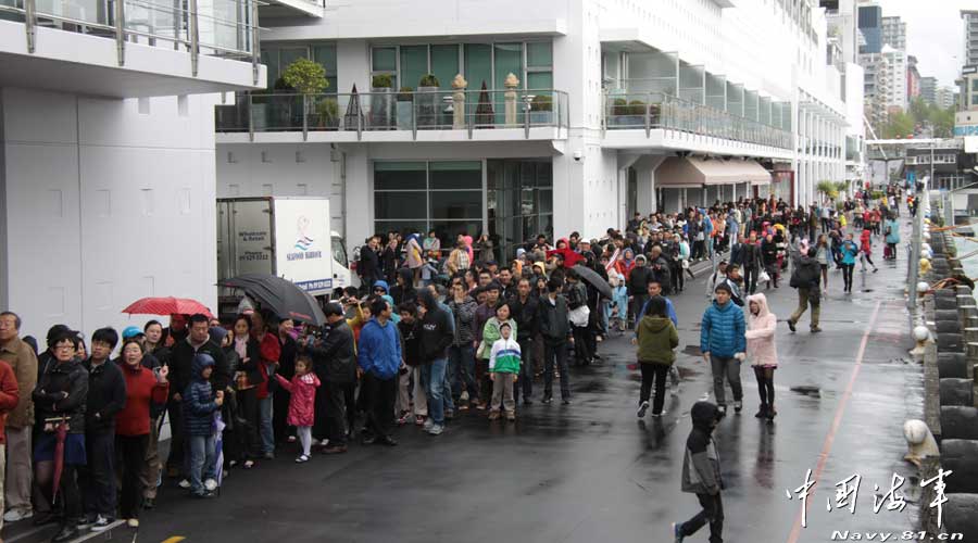 10月12日,到访新西兰的中国海军导弹驱逐舰对当地民众开放参观,图为当地民众踊跃参观青岛舰