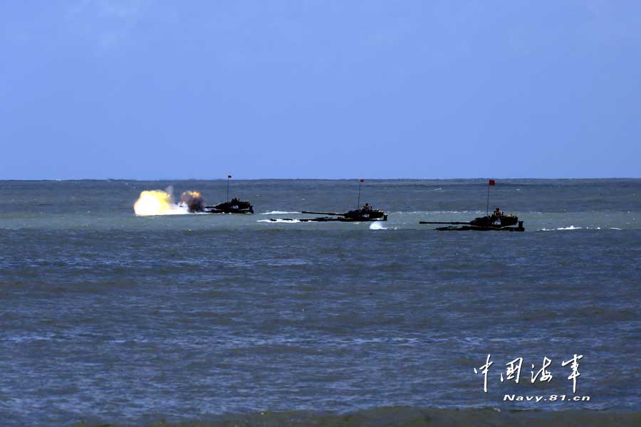 解放军60余辆两栖战车练夺岛 海上猛射炮弹