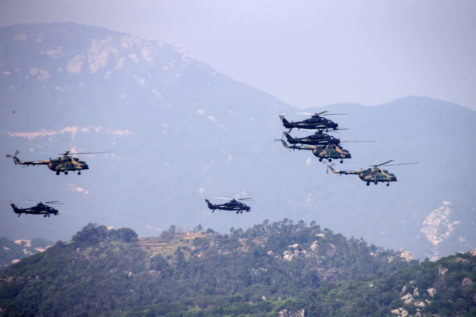 这是参与“使命行动—2013B”跨区机动战役演习的陆航攻击机群(10月20日摄)。电磁空间,电子对抗、网络攻防激烈展开;水际滩头,信息火力一体打击,两栖精兵突击上陆;敌后丛林,特战尖兵从天而降…… 20日上午,东南沿海某地,“使命行动—2013B”跨区机动战役演习实兵实弹演练全面打响。 新华社发(吴泳希 摄)