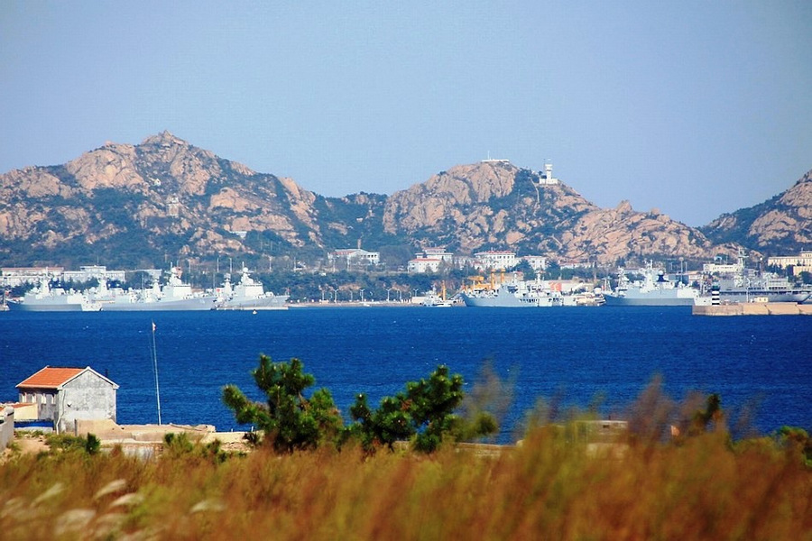 网友于近日在青岛辽宁舰母港拍摄到的辽宁舰航母及其编队的其他舰船