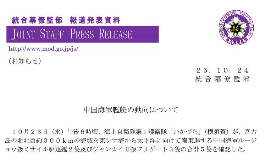 日本防卫省统合幕僚监部10月24日发布的公告