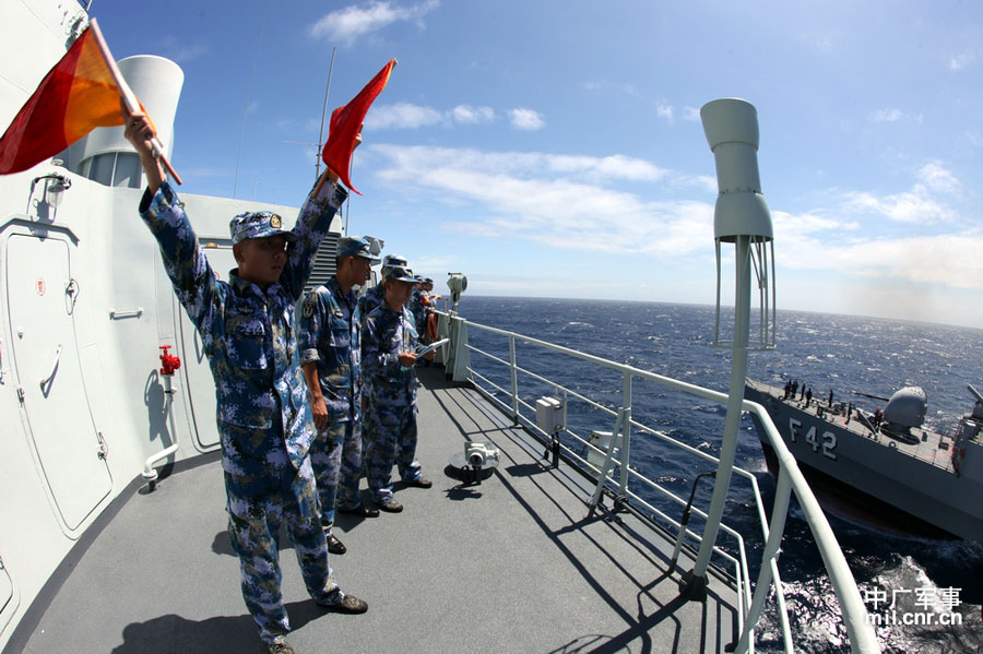 当地时间10月26日中午,中巴海军在海上举行了联合演习。图为中巴海军舰艇进行旗语演练。陶宏祥摄