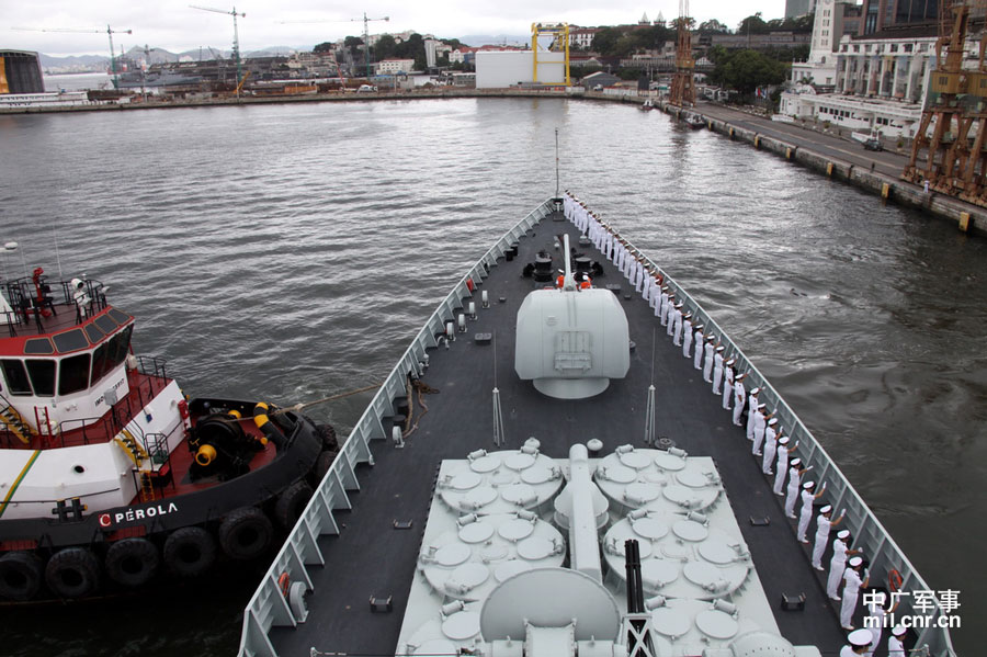 中国海军舰艇编队结束巴西访问,前往阿根廷。图为兰州舰离开里约热内卢港口。陶宏祥摄
