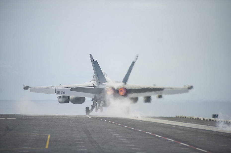 25日,美国海军华盛顿号航母进行舰载机起降训练。