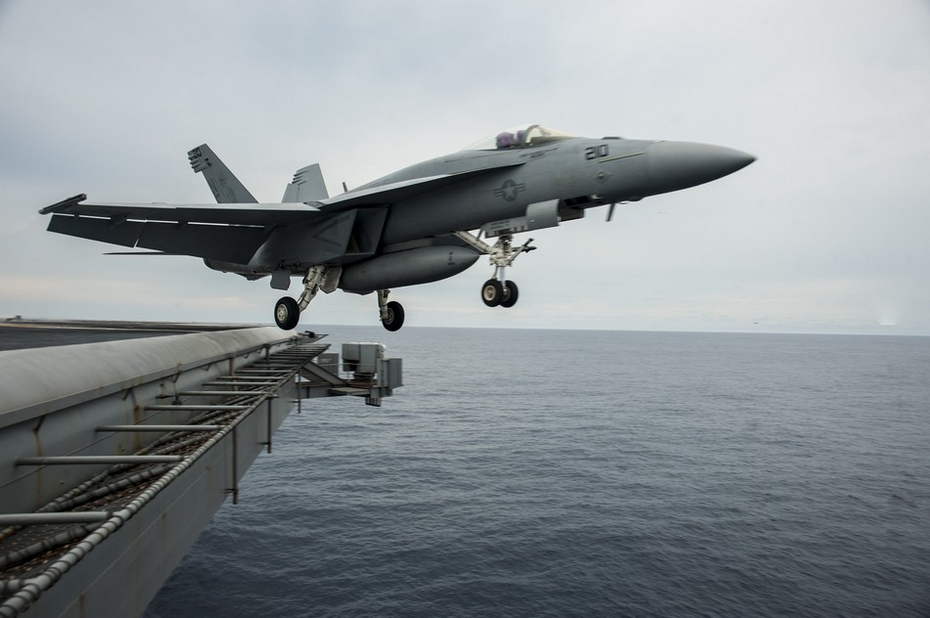 24日,美国海军华盛顿号航母进行舰载机起降训练。