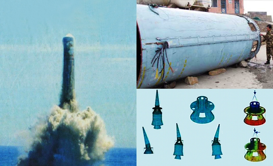 海基战略核力量的研制有三大块任务:艇(重点是二代核反应堆)、弹(重点是先进的固体火箭发动机)和头(小型化热核武器弹头)。(图为巨浪-2导弹发射试验、右侧上图为巨浪-2导弹的一级火箭残骸,右侧下为中国核导弹的核弹头结构)