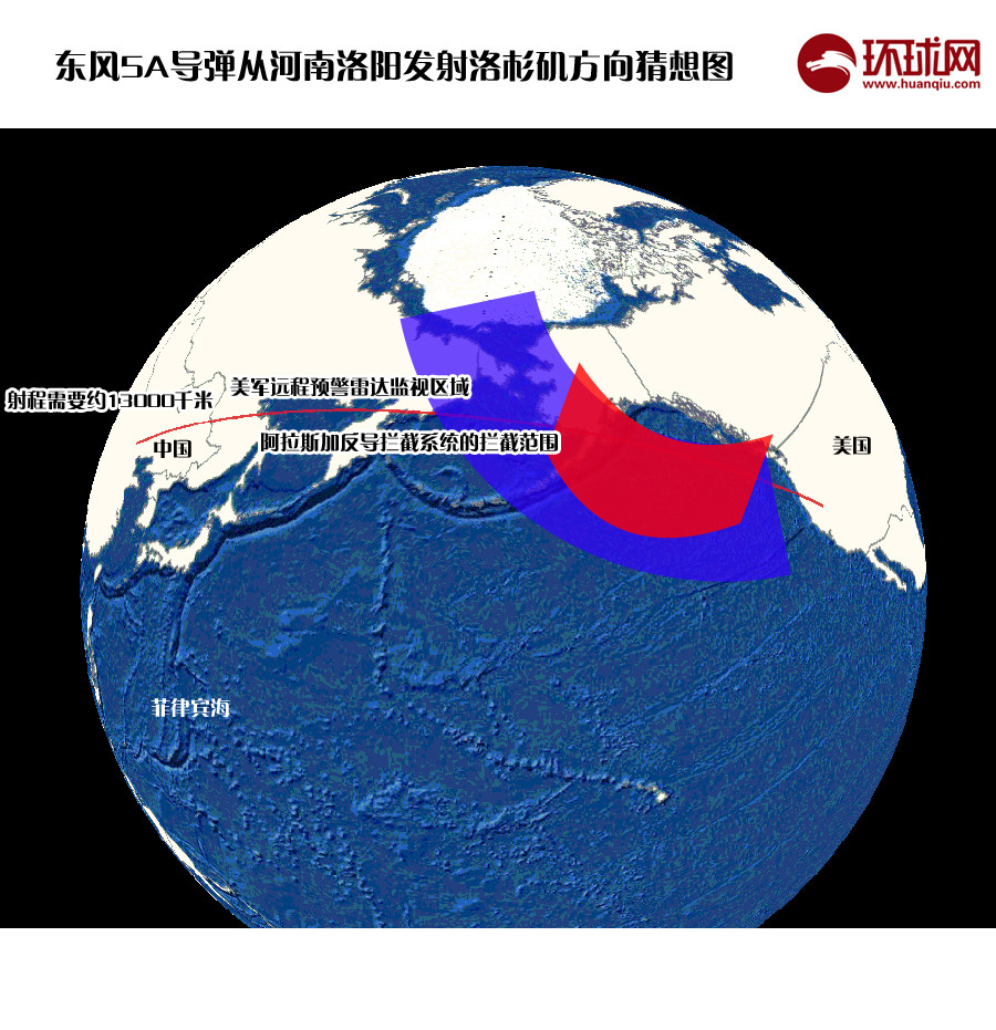 中国最初比较有效的战略核力量是东风-5导弹,这种导弹的射程达到空前的13000千米左右,值得一提的是,在70年代,中国还曾研制过环球轨道打击的30000千米射程的东风-6导弹,后下马。我们从图中可以看到即便是东风-5A导弹,要对美国西海岸洛杉矶市进行核报复已是一件非常艰难的事情,其飞行轨迹要穿越美国在日本的海基反导系统以及美国在阿拉斯加部署的地基反导拦截弹的拦截。东风-5A的突防能力相对来说,非常糟糕,如何突破美国的链接系统是个问题,毫无疑问提高导弹的突防能力,成为中国第二代核武器的主要发展方向。(制图:裴申)