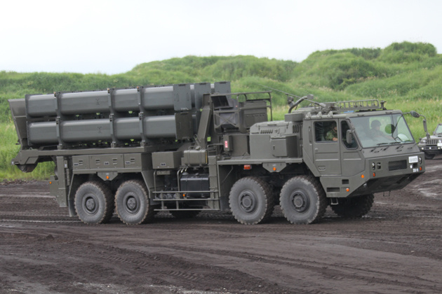 除了88式反舰导弹外,日本最新研制的12式反舰导弹也已经投入使用。这种新型反舰导弹安装在卡车上,采用了与03式中程陆基反舰导弹相同的三菱8×8卡车底盘,其性能与现役88式陆基反舰导弹相比得到了较大提升。