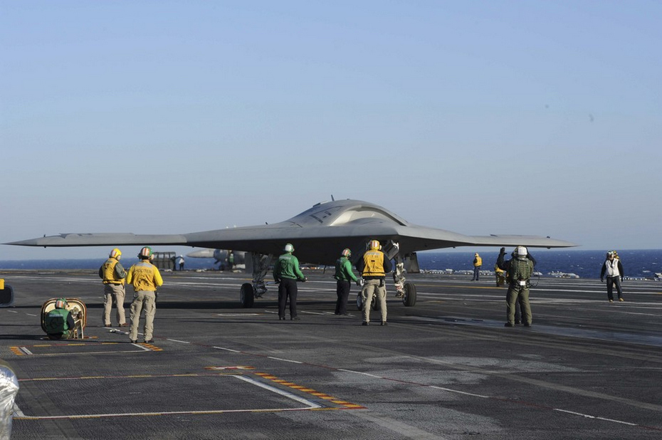 当地时间11月9日,一架X-47B无人舰载机在美国海军西奥多·罗斯福号航母(CVN 71)上进行了起降测试。
