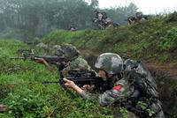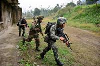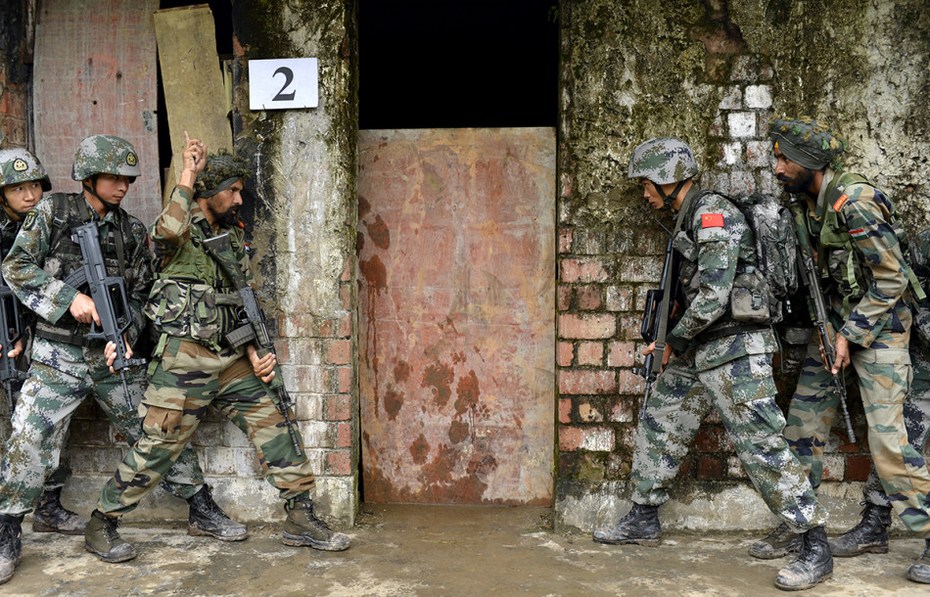 这是中印突击队员进行入室搜缴。 11月13日,“携手-2013”中印陆军反恐联合训练在成都军区某综合训练基场圆满落下帷幕。根据中印两军年度交往计划,中国和印度于11月5日在位于四川峨眉山的成都军区某综合训练场举行“携手—2013”中印陆军反恐联合训练。联训共分三个阶段进行:武器装备展示和技战术训练交流,围绕战术手语、抓捕押解、营救人质等课目进行混编同训,组织以“山地联合反恐怖作战”为课题的综合演练。新华社发(王德思 摄)