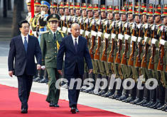 中共中央总书记、国家主席胡锦涛十二日在北京人民大会堂东门外广场举行仪式,欢迎来访的老挝人民革命党中央主席、国家主席坎代·西潘敦。中新社记者 毛建军 摄