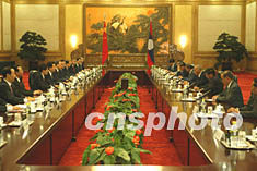 中共中央总书记、国家主席胡锦涛十二日在北京人民大会堂,与来访的老挝人民革命党中央主席、国家主席坎代·西潘敦举行会谈。中新社记者 毛建军 摄