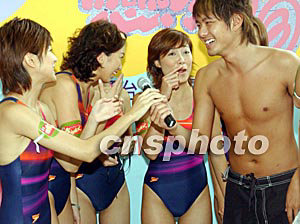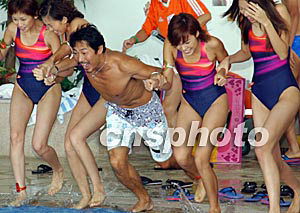 香港歌手萧正楠,七月二十四日在翡翠台推出的消暑剧集《恋爱自由式》比试游泳实力活动上,和身穿泳装的美女们戏耍。中新社记者:钱兴强