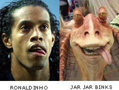 不过,另外一名转会到西甲的巴西球星罗纳尔迪尼奥,就没有这么好的运气,找来一名美女做模仿秀。模仿他的是美国大片《星球大战》中的怪物恰恰宾克斯(Jar-Jar Binks)。在该网站公布的图片上,两“人”显得都被面前的什么景象深深的吸引住,而且舌头不由自主的伸出来。