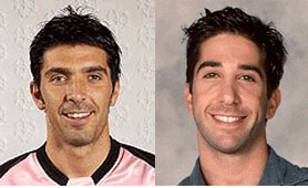 其实,许多球星具有影星的气质,因此现实生活中就不乏一些球星与影星神似组合。该网站列出的布冯的模仿者,就是主演《六人行》而闻名世界的明星大卫·修蒙(David Schwimmer)。另外一名意大利球星皮耶罗也是一个大帅哥,因此他的模仿者就请来了著名演员亚历桑德罗·尼沃拉(Alessandro Nivola)。