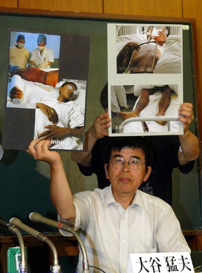 8月13日,在东京举行的声援日军毒气弹受害者集会上,“中国人战争受害者后援会”事务局长大谷猛夫出示由新华网发布的日军毒气弹中国受害者的照片。(新华网图)