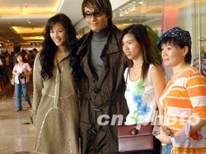 爱情偶像剧《真情告别》主角胡兵和瞿颖首次以“自由行”方式来港,以游客身份在尖沙咀商场购物,图为游客与二人合影。中新社记者:钱兴强