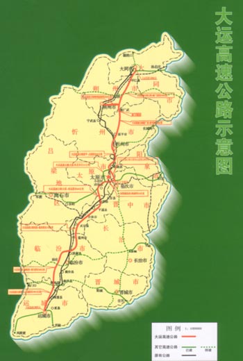 大运高速公路北起古城大同,南至黄河三角洲新兴城市运城,纵贯山西南北,穿越山西8个市地31个县市区132个乡镇495个行政村,全长666公里,双向六车道,总投资222亿元,是国家二连浩特至河口国道主干道线和临汾至三亚重点公路的重要组成部分,是山西“三纵三横”公路最重要的中轴快速通道。
