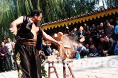 十月,河北吴桥一位硬功杂技演员为游客表演赤手快速劈砖,这位曾以十分钟劈二百多块砖的速度创造了劈砖世界吉尼斯纪录的壮硕演员,在杂技行业已工作三十多年,手上的老茧已如刚铁般坚硬。中新社记者:王丽南