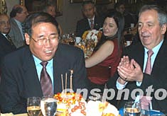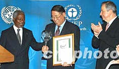 中新社纽约十一月十九日电(记者 陈建)中国环保总局局长解振华十九日获得联合国秘书长安南为他亲自颁发的全球最受尊敬的环境奖——二00三年度联合国笹川环境奖。在纽约举行颁奖典礼这天,恰逢他五十四岁生日。颁奖晚宴上,全场高唱《祝你生日快乐》。经常表情严肃的解振华这时笑得眼睛眯成一条缝,快乐地伴着歌声吹灭了生日蛋糕上的蜡烛。